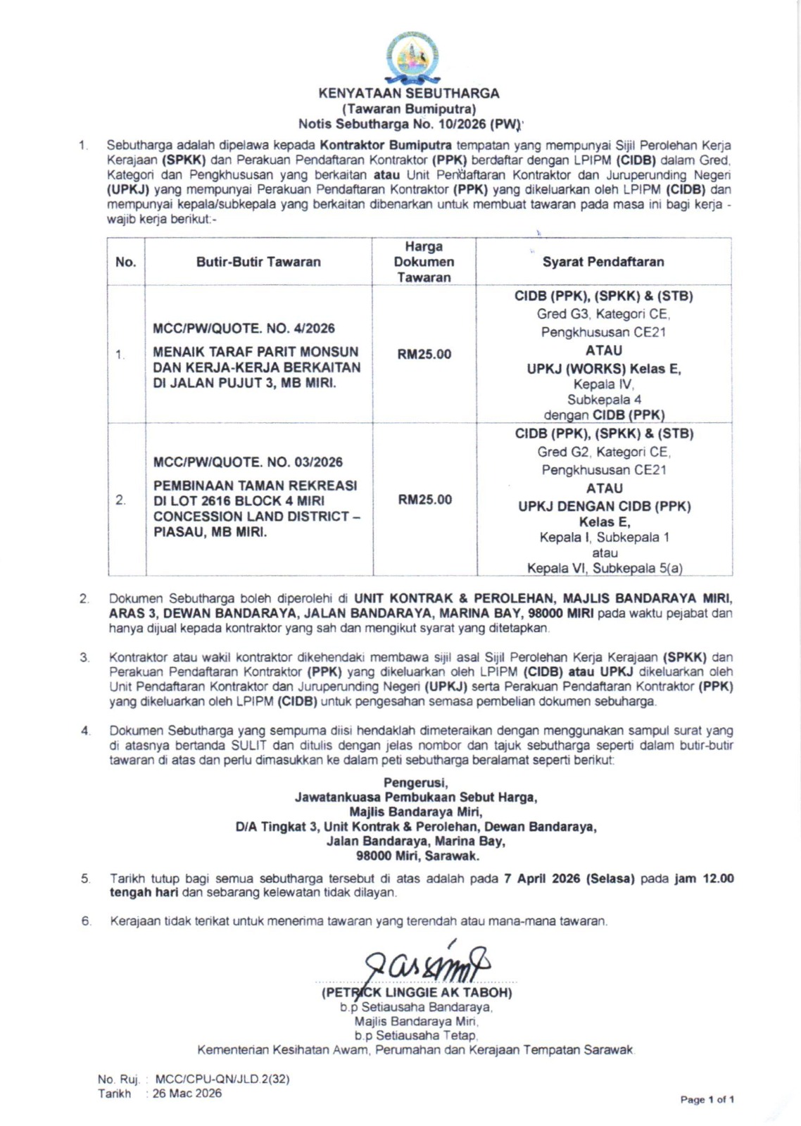 Quotation Notice No. 10/2026 (Closing 7.4.2026) PW